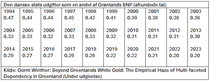 De statslige udgifters andel af det grønlandske BNP faldt fra 47 procent i 1994 til 20 procent i 2023. Ud fra disse data kan man forvente, at Grønland under ellers konstante forhold kan blive økonomisk selvbærende inden for 10 år. Perioden kan være kortere, hvis Grønlands egenproduktion vokser hurtigere end forventet.