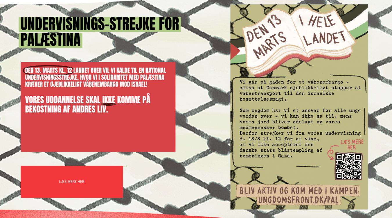 SUF’s opfordring til andre unge er modig og tydelig. De siger: Bland jer i den politiske debat, gå på gaden og tilslut jer en national undervisningsstrejke med krav til den danske regering om et øjeblikkeligt stop af al våbentransport til Israel. Det er afgørende for palæstinensernes fremtid, men det gælder nu! Lige nu.