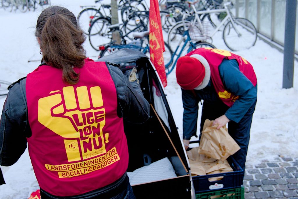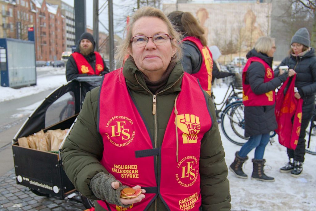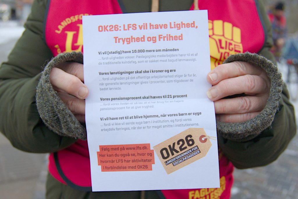 Torsdag morgen stod hun sammen med en håndfuld medlemmer af LFS – Landsforeningen For Socialpædagoger i København ved Trianglen Metro og delte guldmønter, croissanter og løbesedler om OK26 ud til forbipassernede. På løbesedlen står der blandt andet: “Vi vil (stadig) have 10.000 mere om måneden.”