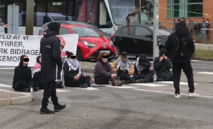 – Vi sad lige uden for Aarhus Universitet med blokaden. For det første har universitetet et samarbejde med Terma. For det andet er Randersvej en tæt befærdet vej, og vi håber at have stoppet lastbiler, der enten kører for Mærsk eller Terma. Og vi gennemførte vores aktion et sted, der var meget visuelt, så mange flere så vores aktion, også inde fra universitetet, fortæller pressetalsperson Andrea Mark Jepsen til Arbejderen.
