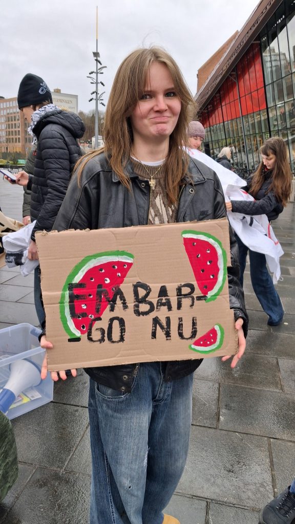 Deres hjemmelavede papskilte med krav om “Våbenembargo” og “Børn er ikke skydeskiver” og bannere med budskaber som “Frit Palæstina” og “Stop våbeneksport til Israel” blev godt modtaget af de forbipasserende.
