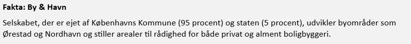 I en rapport fra 2023 erkender By & Havn selv, at målet om 40 procent almene boliger i nye bydele ikke kan nås uden særskilt statslig støtte, fordi jordpriserne ellers gør det umuligt.