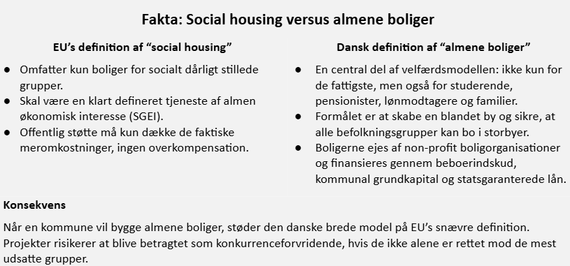 Den blandede by er et politisk mål, men i EU-sprog er “social housing” langt mere snævert, og Kommissionen har gentagne gange slået fast, at undtagelsen kun gælder socialt udsatte borgere, ikke brede befolkningsgrupper.