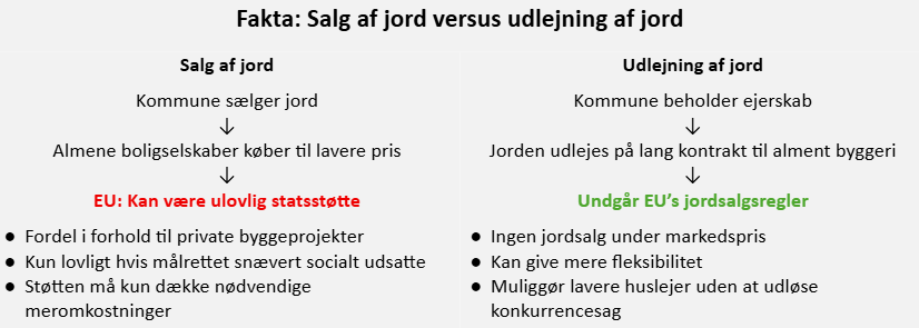 Hvis jorden udlejes til almene boligselskaber på lange lejekontrakter, kan man undgå begrænsningerne fra EU-lovgivningen om jordsalg, fordi der ikke sker et egentligt salg. På den måde kan jorden stilles til rådighed på vilkår, der understøtter lavere huslejer uden at udløse en direkte statsstøttevurdering.