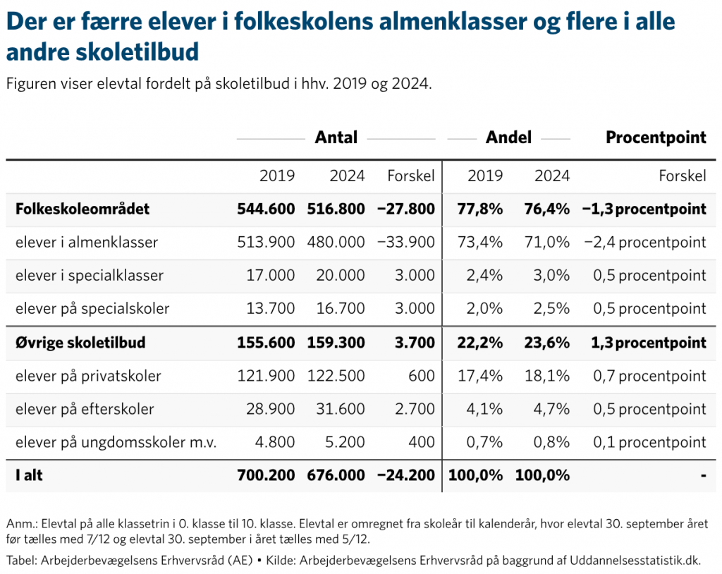 Fra 2019 til 2024 er antallet af elever i almenklasserne faldet med 33.900 svarende til et fald på 6,6 procent. Omvendt er antallet af elever i folkeskolens specialklasser steget med 3.000 elever, en stigning på 17,6 procent. Ligeledes er antallet af elever i specialskoler er steget med 3.000 elever, hvilket her er en stigning på hele 21,9 procent.