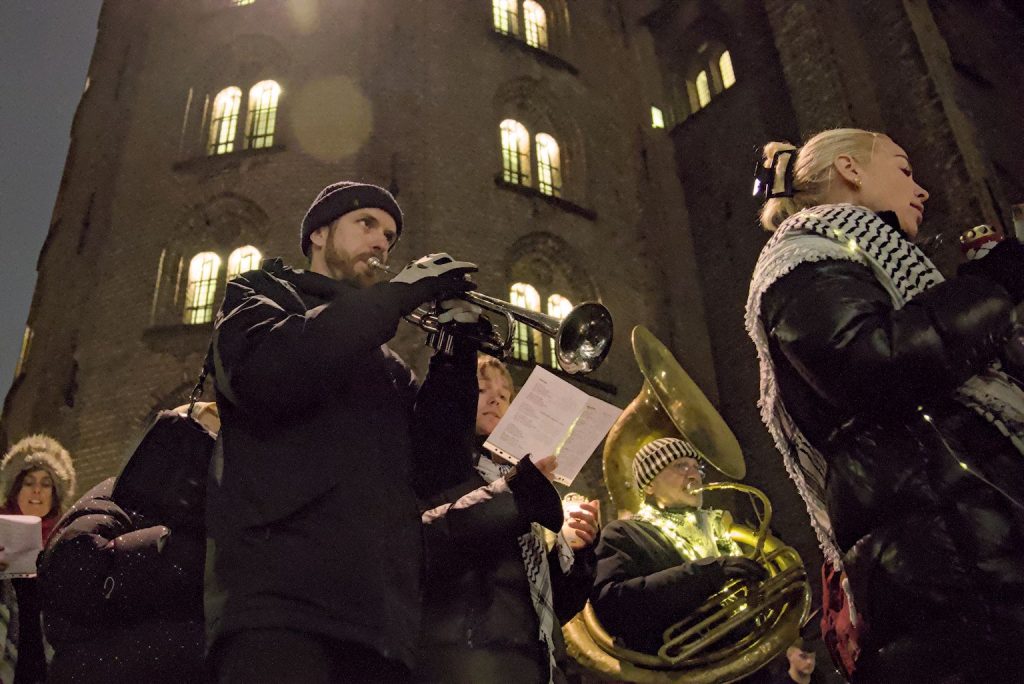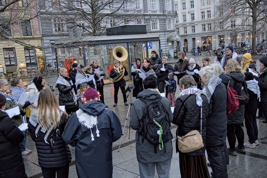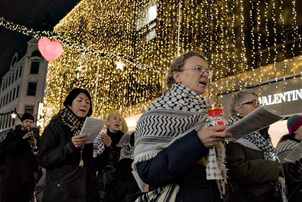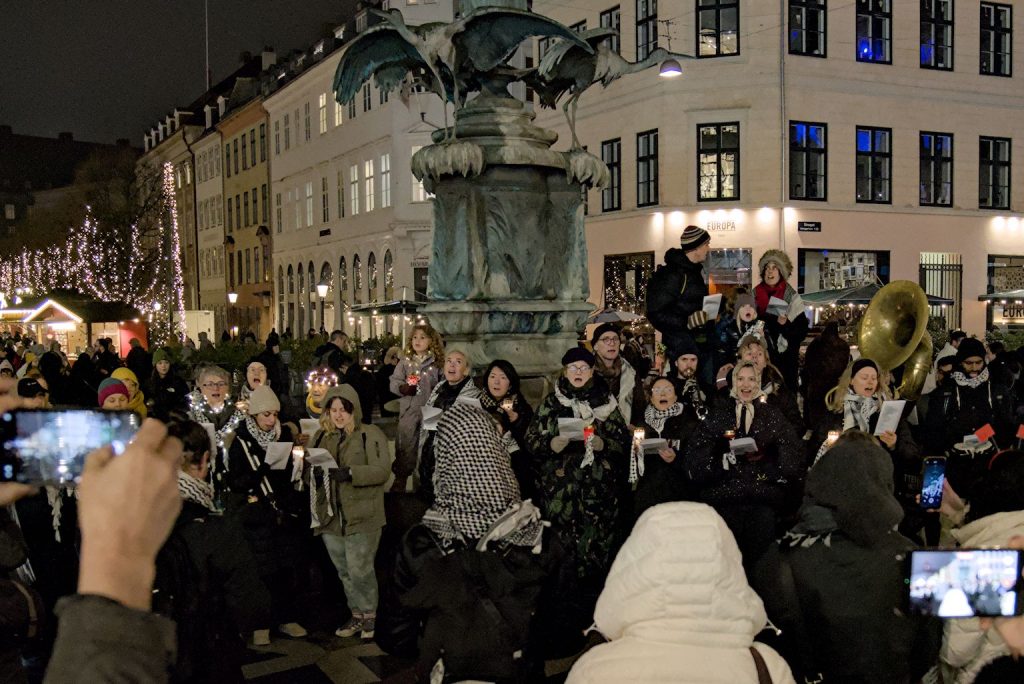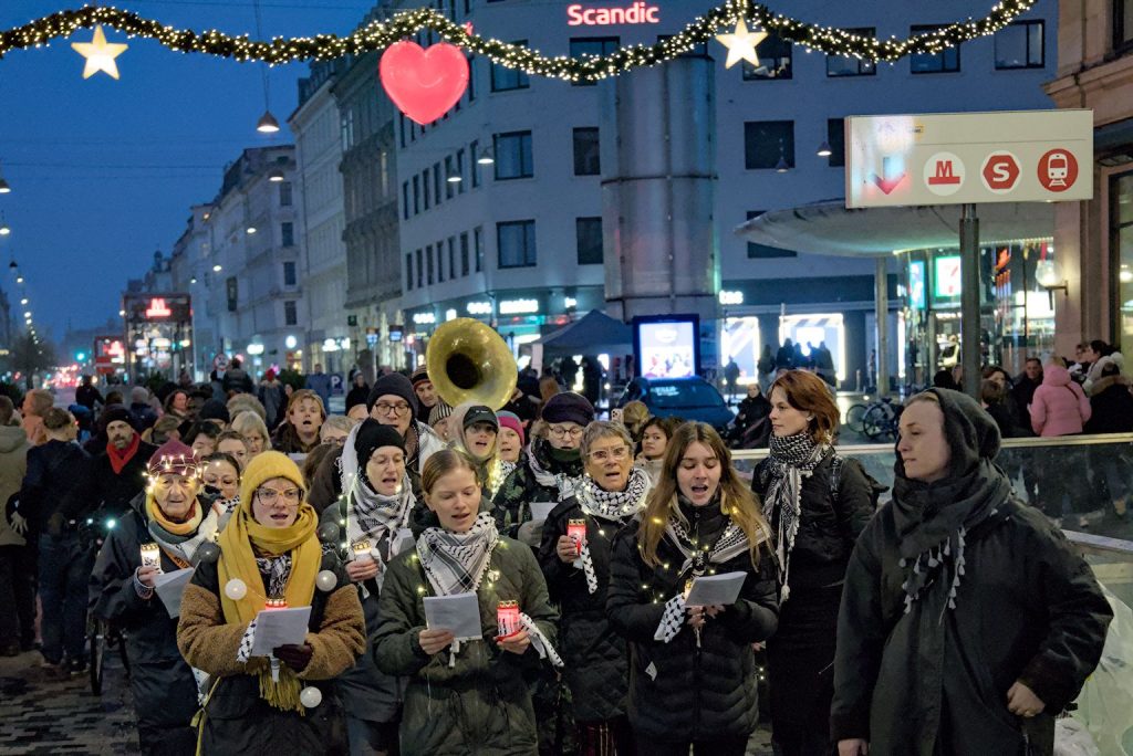 Søndag den 7. december klokken 15 skrår vi over gaden fra Torvehallerne mod det, der i aktivistiske munde hedder “Besættelsesmagtens Plads” (officielt Israels Plads). Ovre i et roligt hjørne af pladsen står en skare på omkring 30 personer, unge og gamle og også en del børn. De fleste har en sort/hvid kuffiyah om halsen, og nogle er pyntet med lyskæder. På denne fugtige eftermiddag, hvor december-mørket allerede er ved at falde på, skal vi opleve PaLucia, der er en slags palæstinensisk Sankta Lucia.