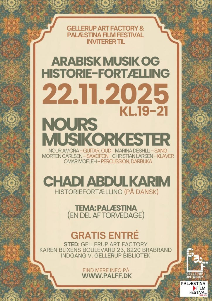 Det bliver en unik kulturoplevelse, når Gellerup Art Factory og Palæstina Film Festival byder velkommen til en aften med: Arabisk musik og historiefortælling med temaet Palæstina: