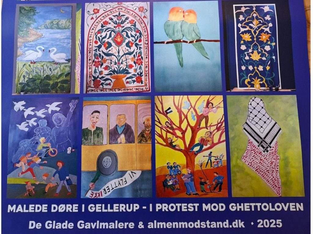Malede døre i Gellerup – i protest mod ghettoloven: Thomas Kruse, kunstner og grafisk designer, har i samarbejde med beboere udsmykket døre i opgange i de tomme boligblokke. Han vil præsentere en ny plakat (billedet), fremvise billeder af dørene og fortælle om projektet.