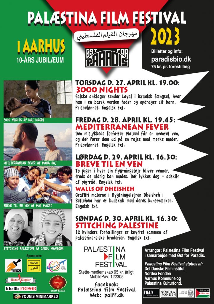 Palæstina Film Festival 2023 støttes økonomisk af Det Danske Filminstitut, Nordea Fonden, Aarhus Kommune, Græsrodsfonden og Palæstina Kulturfond.