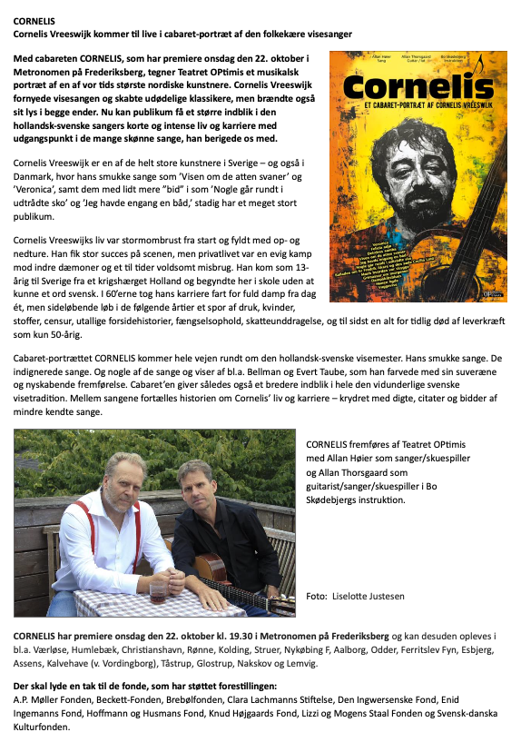 Den folkekære visesanger Cornelis Vreeswijk kommer til live i cabaret-portræt. I dag er premiere. Herefter kommer den rundt i landet.
