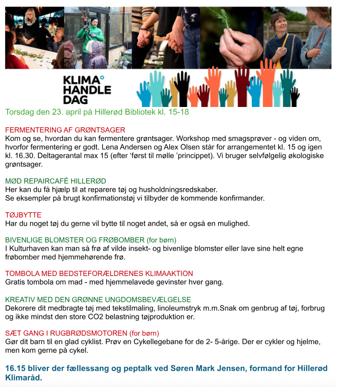 Torsdag den 23. april danner Hillerød Bibliotek og Kulturhaven rammen om årets Klimahandledag. Programmet starter klokken 15 og slutter klokken 18.