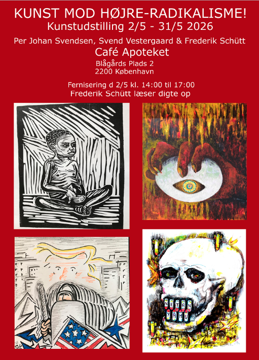 Svend Vestergaard, Frederik Schütt og Per Johan Svendsen inviterer til fernisering den 2. maj klokken 14 til 17 i Café Blågårds Apotek, Blågårds Plads 2.