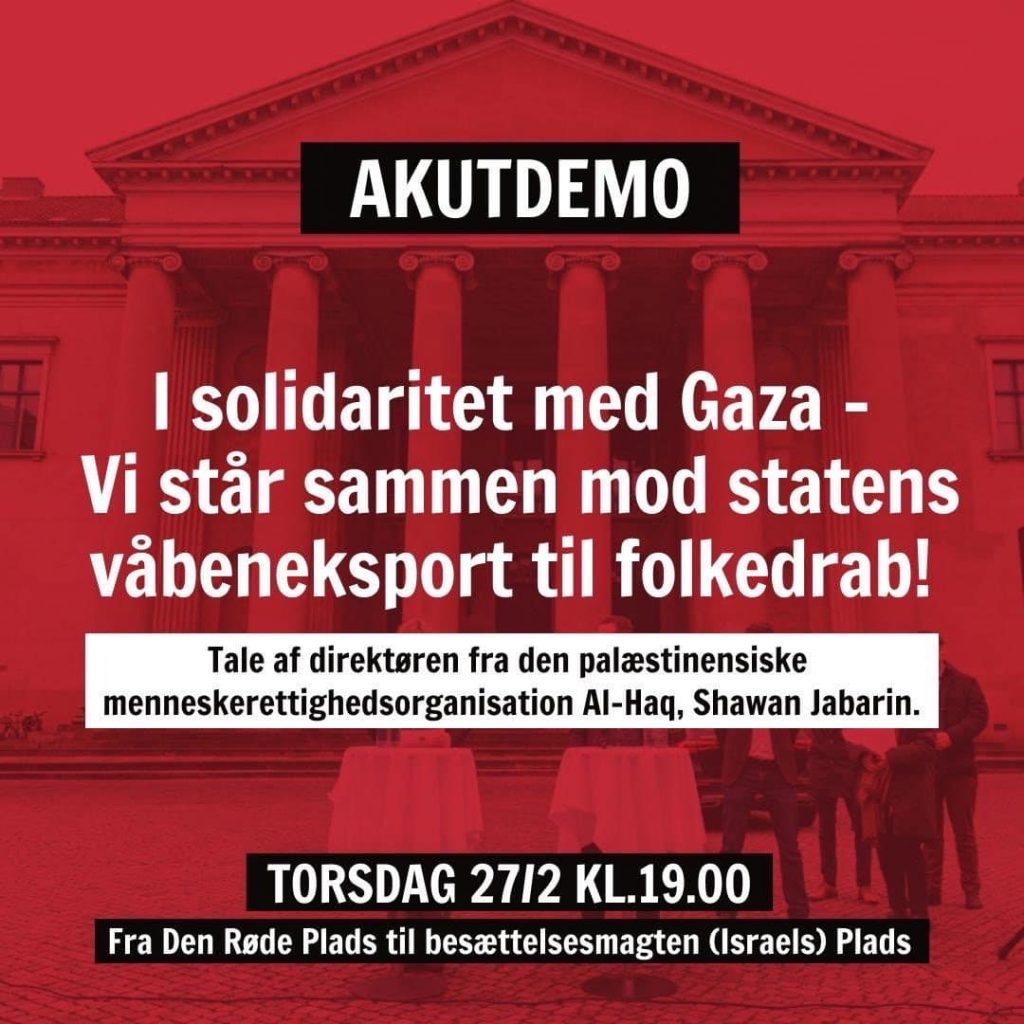 Mød op til akutdemonstration i aften klokken 19:00 fra Den Røde Plads til besættelsesmagtens (Israels) Plads.