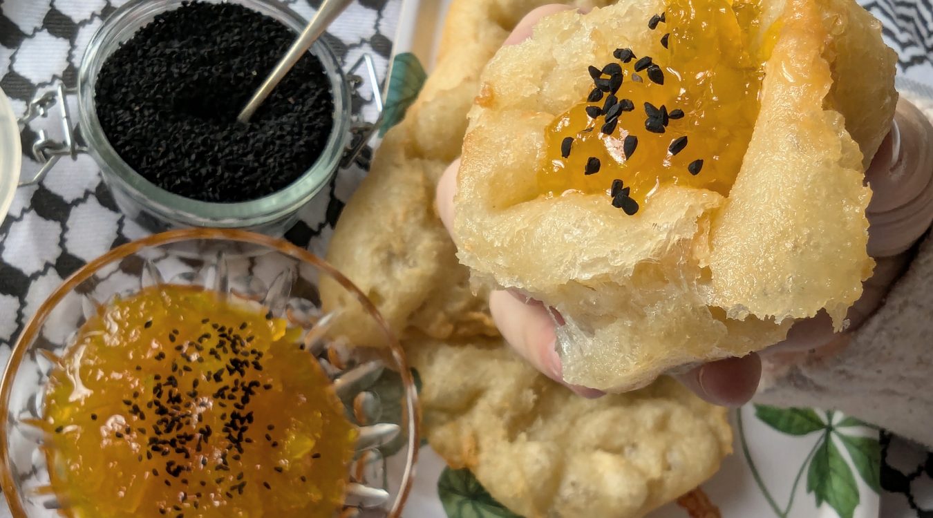 Varm olien op i stegepanden, ikke for varmt – de skal være lysebrune og bløde, ikke sprøde. Læg en trekant i olien, og fold den ud, hvis den ruller sig sammen. Dejen må gerne boble lidt op under stegningen. Tag dem op, inden de bliver for faste til at kunne rulles. Sprinkel nigellafrø på hver trekant efterhånden som de bliver færdige.