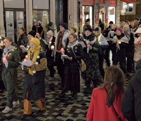 Stærkt rørende var Dana Alshihaby, der herefter sang smukt og inderligt a cappella. Hun er selv palæstinenser og født i en flygtningelejr i Syrien. Hun sang folkesange og traditionelle sange om palæstinensernes liv og lod, om Nakba, om Israels indtagelse af Jerusalem, om afsavn og længsel. Men også om “håbet som er kærligheden, som skal overvinde krig”.