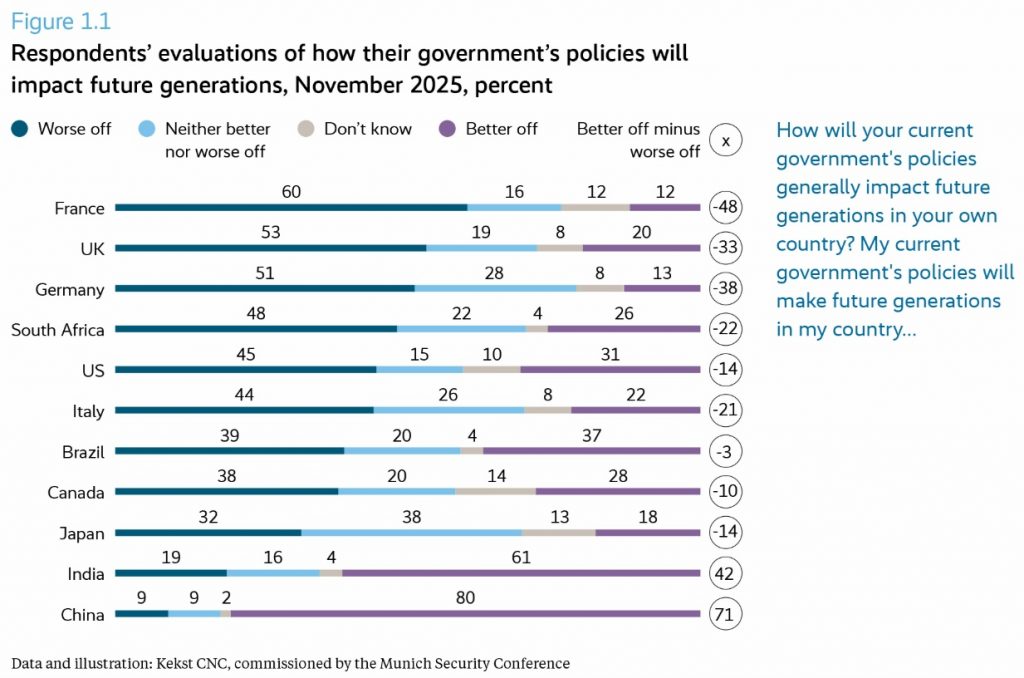 Fra Frankrig til USA frygter befolkningerne i Vesten, at deres nuværende regeringer og deres politik kun vil forværre vilkårene for de kommende generationer. Det står i skarp kontrast til Kina, hvor et overvældende flertal mener, at deres regering fører en politik, der gør fremtiden bedre for befolkningen.